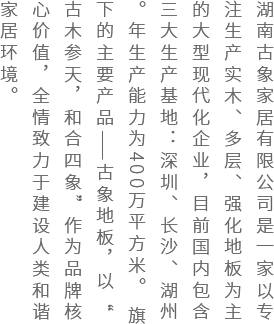 古象地板是湖南古象家居有限公司旗下的品牌,是專(zhuān)注于生產(chǎn)實(shí)木、多層、強(qiáng)化地板的木地板廠(chǎng)家,目前國(guó)內(nèi)包含三大生產(chǎn)基地:深圳、長(zhǎng)沙、湖州。年生產(chǎn)能力為400萬(wàn)平方米。品牌成立多年以來(lái),以強(qiáng)大的實(shí)力和盡善盡美的產(chǎn)品以及誠(chéng)信經(jīng)營(yíng)獲得廣大用戶(hù)和合作伙伴滿(mǎn)意和信任,古象地板已經(jīng)廣泛應(yīng)用于國(guó)內(nèi)各大城市的樓盤(pán)、酒店、公共區(qū)域。